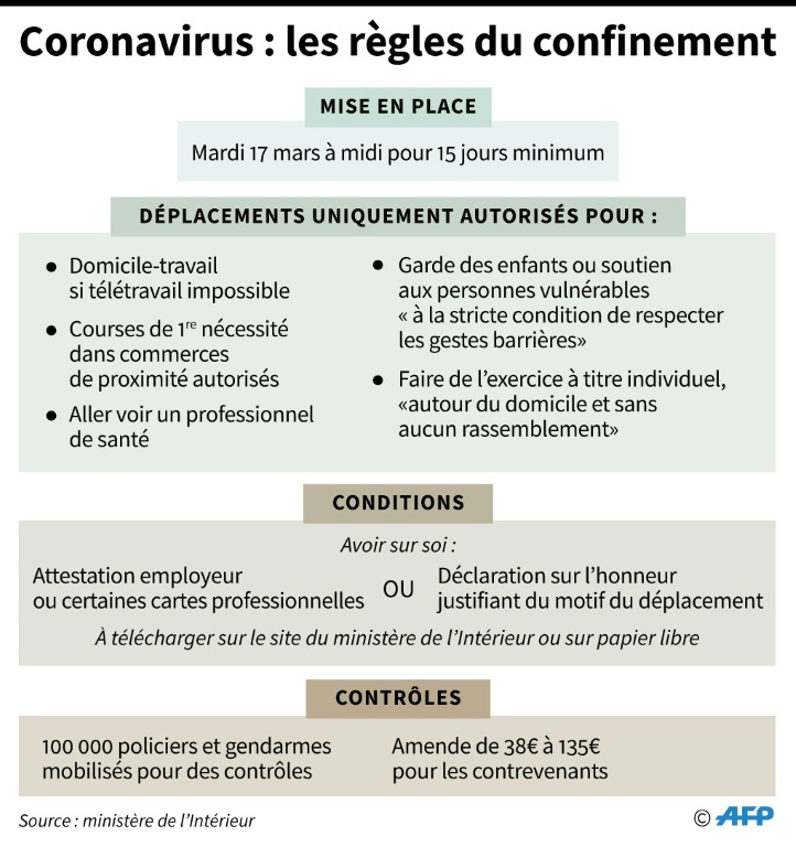 Les Français doivent "rester chez eux", a martelé mardi soir le Premier ministre, Edouard Philippe, lors d'une intervention depuis Matignon. L'amende forfaitaire pour "violation des interdictions de se déplacer hors de son domicile" est passée à 135 euros. L'ensemble de la population est tenue de rester cloîtrée à la maison sauf pour se nourrir, se soigner ou travailler, en particulier les personnels de santé et les forces de l'ordre.