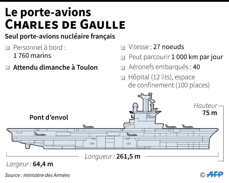 Après l'accostage prévu dans l'après-midi avec 10 jours d'avance sur la mission prévue, du porte-avions dans son port d'attache, une opération logistique lourde de débarquement de tout l'équipage doit débuter. "Tout le monde sera testé", et les militaires, quelque 1.700 personnes qui servaient sur le Charles-de-Gaulle plus 200 de la frégate qui l'accompagnait, seront confinés pour un isolement sanitaire de deux semaines, sans contact avec leur famille, "sur des emprises militaires du Var et de la région".