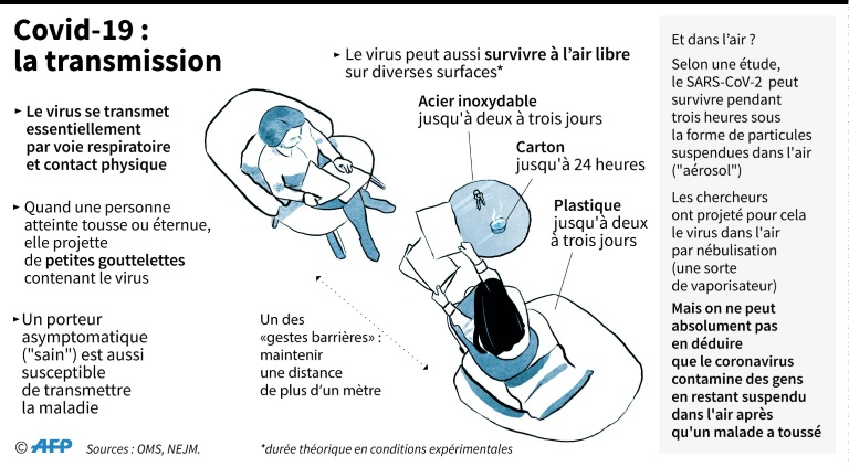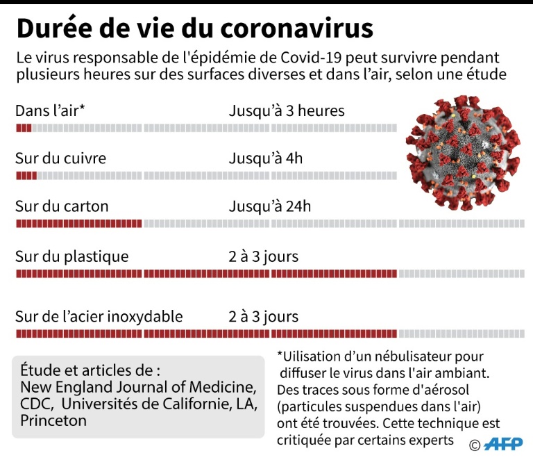 En outre, on peut être contaminé en touchant un objet infecté puis en portant sa main à son visage (yeux, nez, bouche...) Une étude publiée mardi dans la revue américaine NEJM a montré que le nouveau coronavirus est détectable jusqu'à deux à trois jours sur des surfaces en plastique ou en acier inoxydable, et jusqu'à 24 heures sur du carton.