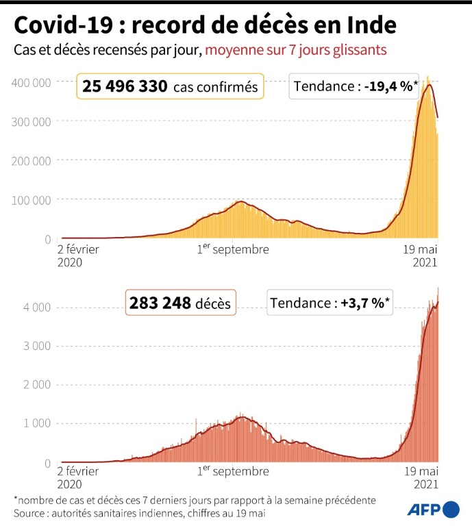 L'Inde a enregistré un nouveau record de 4.529 décès dus au Covid-19 en 24 heures, toujours sous l'effet d'une violente deuxième vague épidémique, tandis que le nombre de nouvelles contaminations tendait à diminuer. L'épidémie continue à progresser en Malaisie où plus de 6.000 nouveaux cas ont été recencés mercredi.