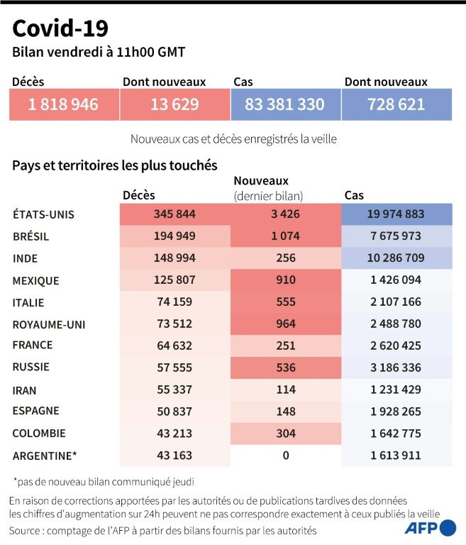 La pandémie a fait au moins 1.818.946 morts dans le monde pour plus de 82 millions de personnes contaminées, selon un bilan établi par l'AFP vendredi vers 11H00 GMT d'après des chiffres officiels.