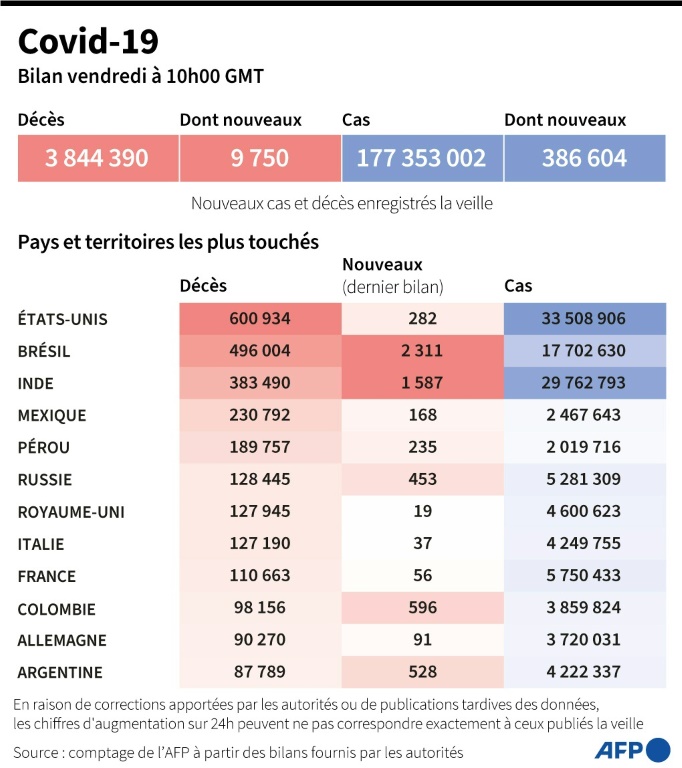 La pandémie a fait plus de 3.844.390 morts dans le monde depuis fin décembre 2019, selon un bilan établi par l'AFP à partir de sources officielles vendredi en milieu de journée.