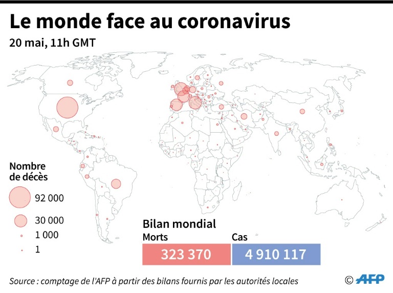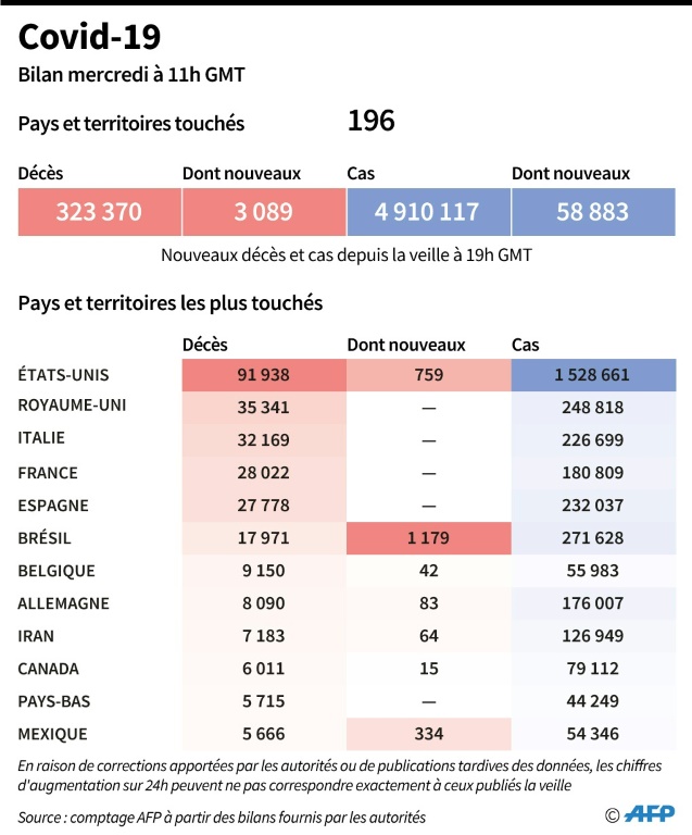 La pandémie a fait au moins 323.370 morts dans le monde depuis son apparition en décembre en Chine, selon un bilan établi par l'AFP à partir de sources officielles mercredi à 11H00 GMT. Plus de 4.910.110 cas de contamination ont été diagnostiqués dans 196 pays et territoires.