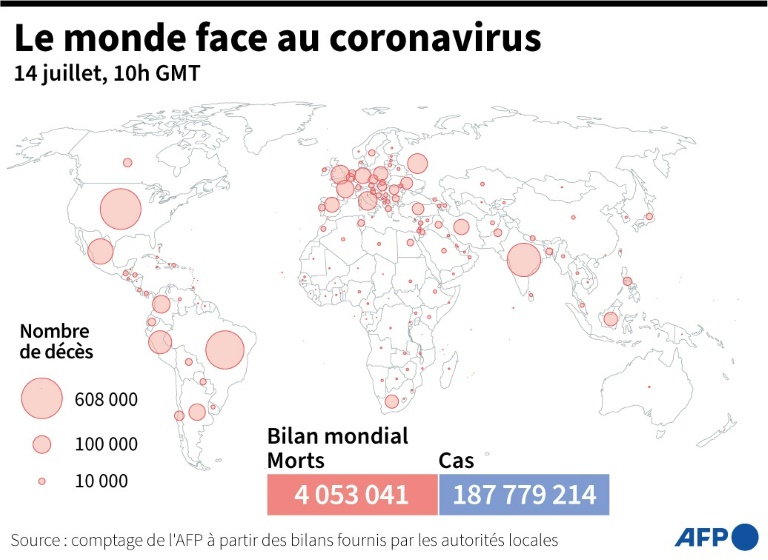 La pandémie a fait au moins 4,053 millions de morts dans le monde depuis l'apparition de la maladie fin décembre 2019, selon un bilan établi par l'AFP à partir de sources officielles mercredi en milieu de journée.