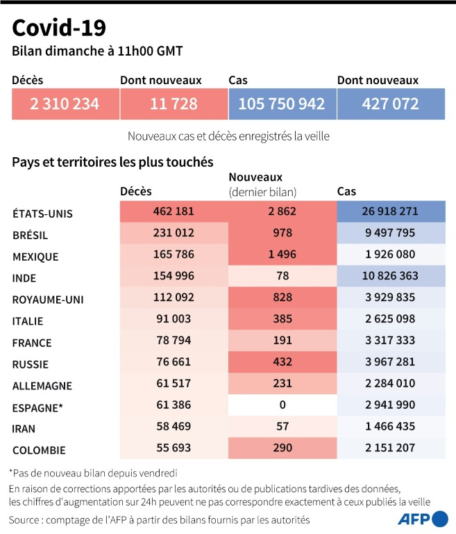 Plus de 105,7 millions de cas d'infection ont été diagnostiqués. Les Etats-Unis sont le pays comptant le plus de morts (462.181), devant le Brésil (231.012), le Mexique (165.786), l'Inde (154.996) et le Royaume-Uni (112.092).