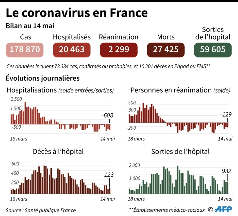 Côté sanitaire, la situation souvent dramatique dans les maisons de retraite pour personnes dépendantes (Ehpad) s'est traduite dans les chiffres jeudi soir: le bilan y dépasse la barre symbolique des 10.000 morts, sur un total d'au moins 27.425 décès du Covid-19 en France depuis le 1er mars. Mais la pression sur les services d'urgence continue de décroitre.
