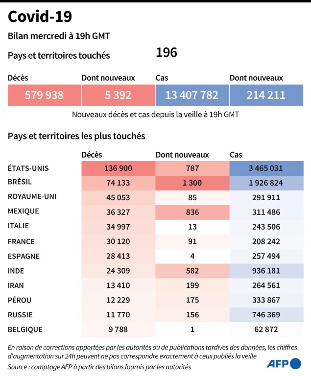 Plus de 13,4 millions de personnes ont contracté le nouveau coronavirus et près de 580.000 décès ont été recensés dans le monde à ce stade. Sur tous les continents, la pandémie provoque une vague de reconfinements et de nouvelles mesures comme le port obligatoire du masque, qui gagne du terrain notamment aux Etats-Unis bien qu'une partie de la population reste rétive à son usage.
