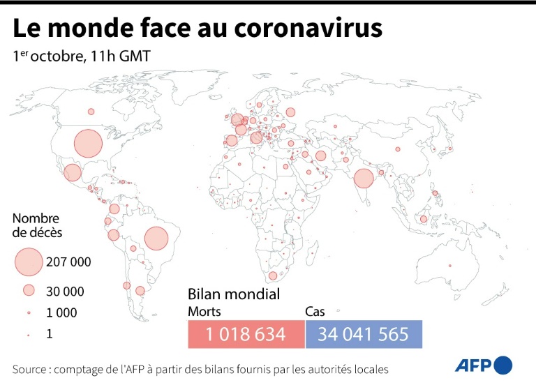 La pandémie a fait au moins 1.018.634 morts dans le monde, selon un bilan établi par l'AFP. Plus de 34 millions de cas d'infection ont été diagnostiqués. Les Etats-Unis sont le pays le plus touché, tant en nombre de morts (207.743) que de cas (7.273.943). Suivent le Brésil (144.680 morts), l'Inde (98.678), le Mexique (77.646) et le Royaume-Uni (42.143).