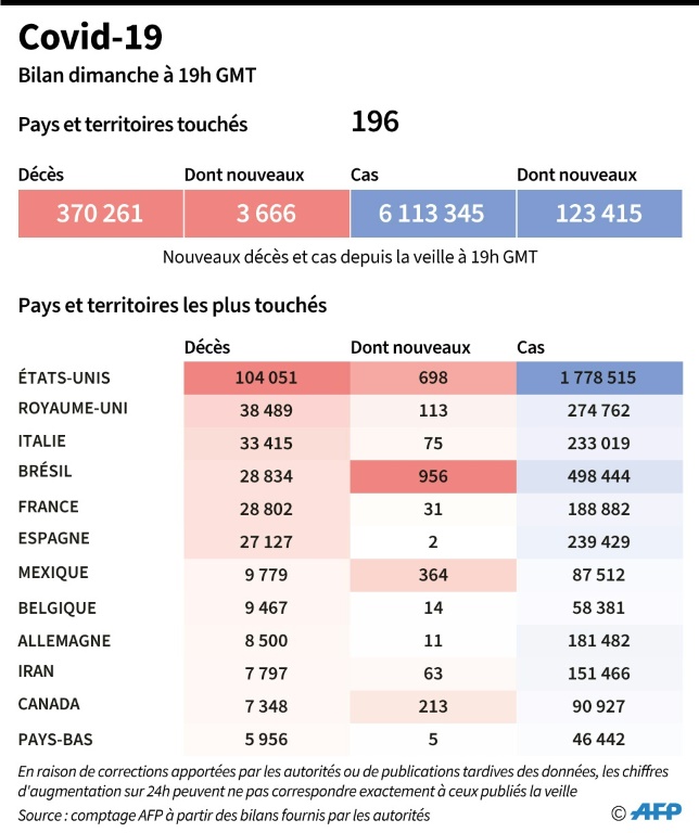 En Europe, l'amélioration de la situation sanitaire conduit à la levée progressive des restrictions imposées aux populations pour enrayer la propagation de la maladie, qui a fait quelque 370.000 morts et contaminé plus de six millions de personnes dans le monde.