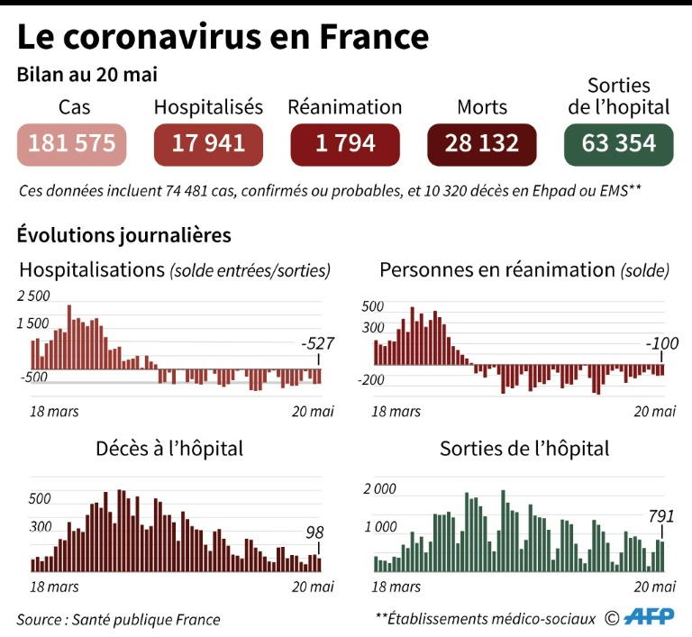 S'affichant "extrêmement vigilant", le ministre de la Santé a toutefois souligné qu'il était "trop tôt pour tirer des conclusions" sanitaires de la levée partielle du confinement de la population, le 11 mai, même s'il n'y a pas pour l'heure de signes d'une "re-croissance" de la circulation du coronavirus, qui a fait au moins 28.132 morts en France selon le dernier bilan mercredi soir.