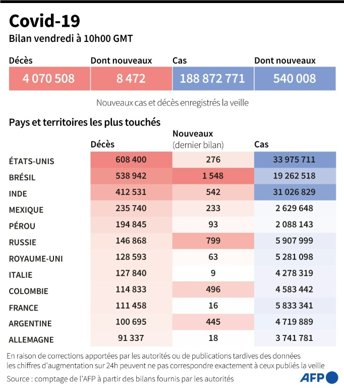 La pandémie a fait au moins 4.070.508 morts dans le monde depuis décembre 2019, selon un bilan établi par l'AFP à partir de sources officielles vendredi à 10H00 GMT.