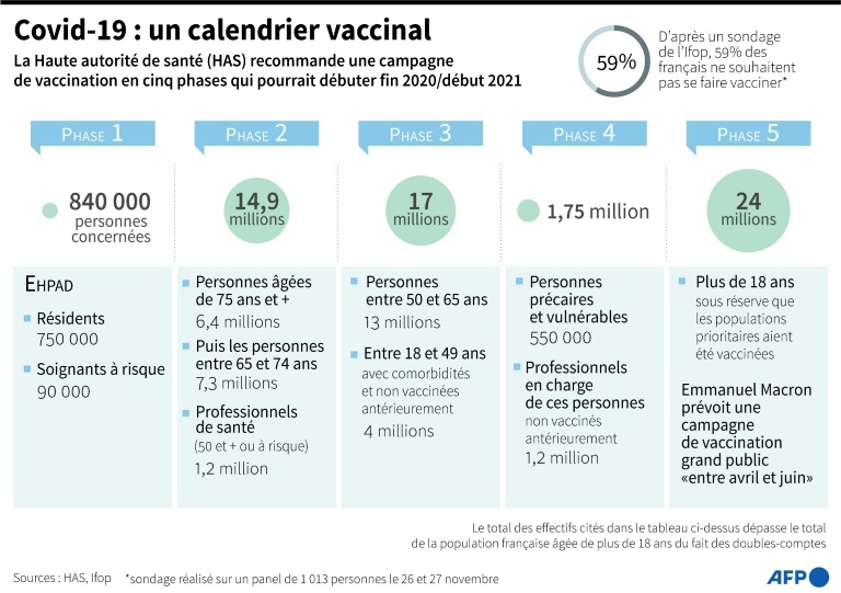 Deux grandes phases sont envisagées. Une première campagne de vaccination "très ciblée" entre fin décembre et début janvier pour les personnes prioritaires, suivie par une deuxième campagne "plus large" destinée au grand public, entre avril et juin. "Il y a l'appréhension, c'est normal puisqu'on n'a jamais sorti un vaccin aussi rapidement, mais nous avons besoin" de la vaccination. "Ce sera la responsabilité des pouvoirs publics de convaincre les Français de les rassurer, de faire beaucoup de pédagogie", résume le Premier ministre Jean Castex.
