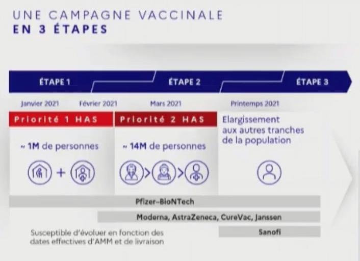 Plusieurs étapes doivent être franchies avant de pouvoir distribuer le vaccin. La vaccination doit faire baisser la mortalité et les formes graves du virus. Trois principes seront respectés : personne ne sera obligé de se faire vacciner, le vaccin sera gratuit et la vaccination se fera dans le respect des règles sanitaires. La "campagne vaccinale" doit protéger en prorité les personnes soumises à des formes graves du virus. La Haute autorité de santé (HAS) prévoit de faire bénéficier le vaccin en priorité aux personnes âgées placées dans les Ehpad ainsi que les professionnels de santé présents dans ces établissements.