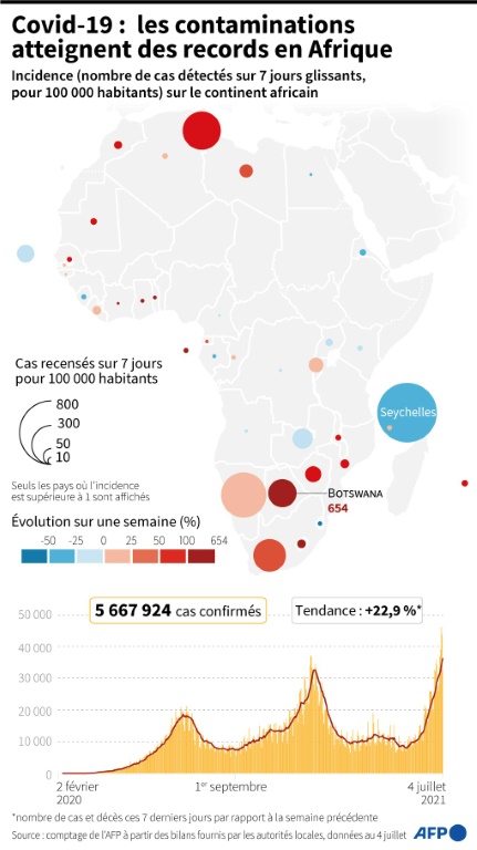 Les contaminations sont à la hausse aussi en Afrique, où plus de 36.000 cas quotidiens ont été recensés ces sept derniers jours, un record sur le continent depuis le début de la pandémie, selon un comptage de l’AFP à partir de bilans officiels.