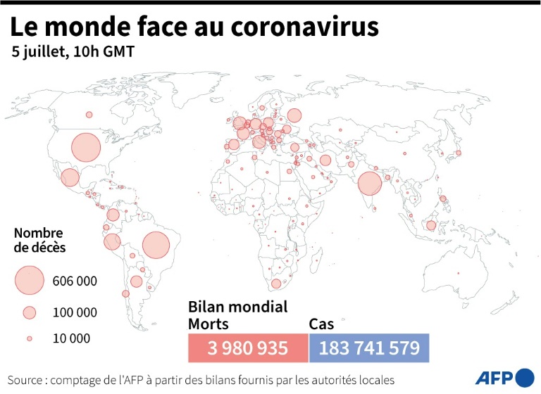Le Covid-19 a fait au moins 3,98 millions de morts depuis son apparition fin 2019, selon un bilan établi lundi par l'AFP.