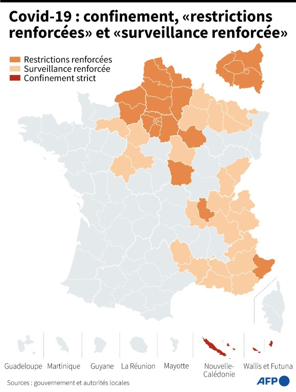 Ces déclarations lui ont valu un tir nourri de l'opposition, qui y a vu vendredi une preuve d'"arrogance". Pour l'heure, 19 départements sont soumis à des mesures de "freinage renforcé": pas de déplacements à plus de 10 km sans dérogation, pas de sortie de la région sans motif impérieux, de nouveaux commerces fermés et des demi-classes en lycée.