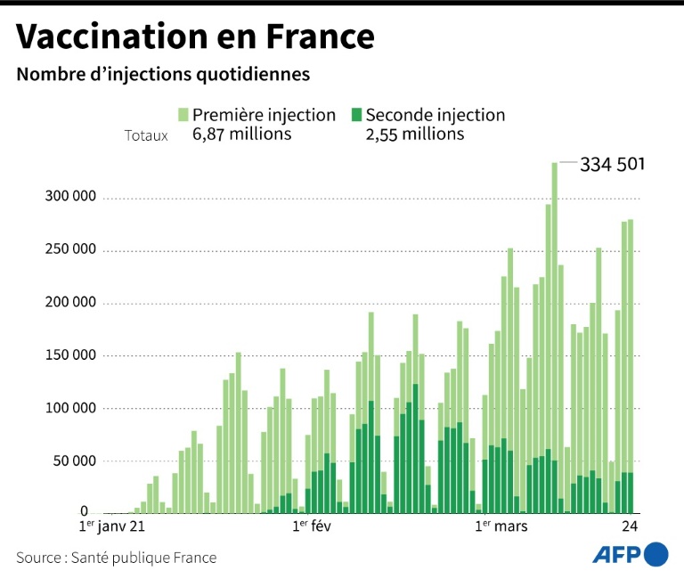 Dans l'immédiat, "l'élément limitatif de notre campagne" de vaccination n'est pas le nombre de vaccinateurs potentiels mais "les livraisons de vaccins qui nous sont faites", a toutefois concédé M. Véran jeudi. La vaccination, qui a déjà permis de faire fortement baisser la mortalité en Ehpad, progresse (7,1 millions de premières doses et 2,6 millions de deuxièmes doses), mais trop lentement pour protéger toute la population.