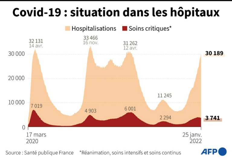 Au total, 30.189 patients Covid sont actuellement hospitalisés (29.748 lundi), un niveau qui se rapproche du pic enregistré en novembre 2020.