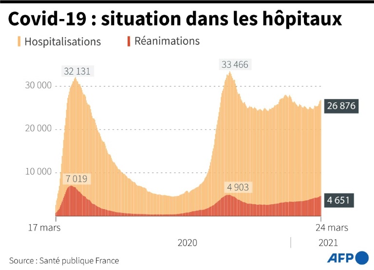 Dans les Hauts-de-France, les hospitalisations ont même dépassé les niveaux atteints lors des deux premières vagues, a annoncé jeudi l'Agence régionale de santé. "Tout est plein en permanence", résume à l'AFP Stéphane Gaudry, professeur de médecine intensive et réanimation à l'hôpital Avicenne, à Bobigny (Seine-Saint-Denis). "On va faire le maximum pour accueillir tous les malades qui ont besoin de la réanimation, en déprogrammant, en réduisant la prise en charge des autres malades qui sont moins urgents", poursuit le médecin.