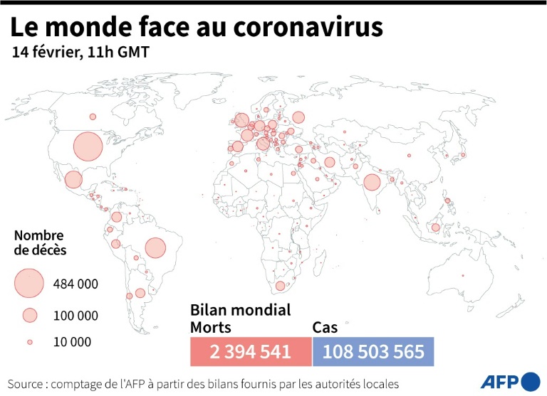 Le Royaume-Uni a franchi la barre des 15 millions de personnes vaccinées contre le coronavirus, tandis que le Japon a donné son premier feu vert à un vaccin contre le coronavirus à cinq mois de l'ouverture des jeux Olympiques d'été. A l'échelle mondiale, 172,10 millions de doses de vaccins ont été administrées dans au moins 95 pays ou territoires. La pandémie du nouveau coronavirus a fait 2.394.541 morts dans le monde