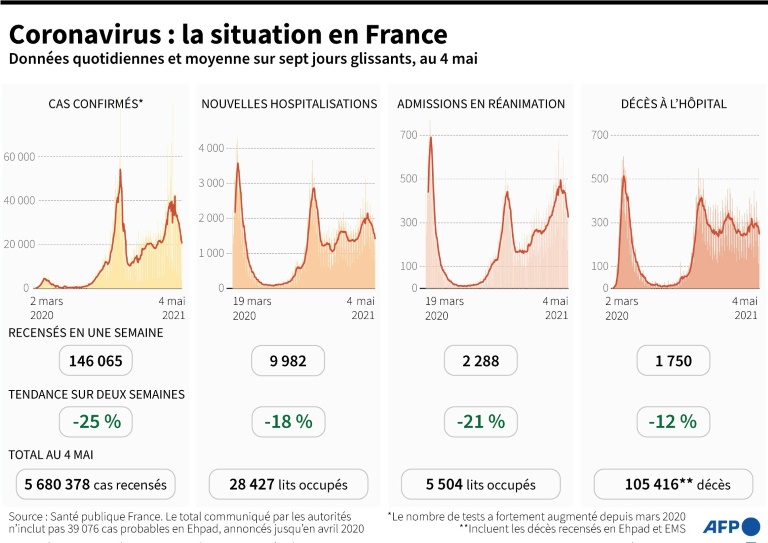 À deux semaines de la prochaine étape du déconfinement, la situation épidémique s'améliore lentement en France, mais les hôpitaux sont toujours confrontés à une charge élevée de malades du Covid-19 et des experts sanitaires s'inquiètent toujours d'une réouverture prématurée.