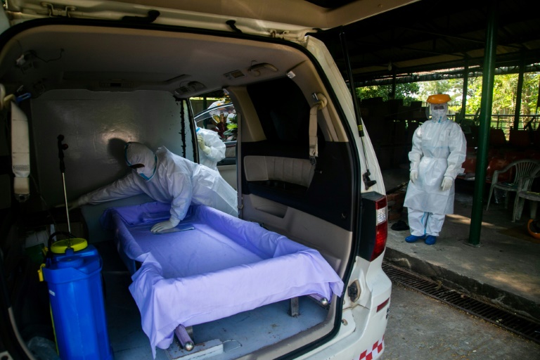 Vêtus de combinaisons de protection, de gants en caoutchouc, de lunettes et d'écrans faciaux, ils sillonnent 24 heures sur 24 les rues encombrées de Rangoun, sirènes hurlantes.