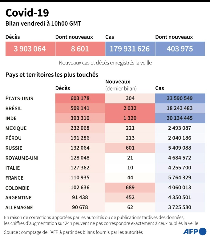 La pandémie du nouveau coronavirus a fait au moins 3.903.064 morts dans le monde depuis fin décembre 2019, selon un bilan établi par l'AFP vendredi à 10H00 GMT. Les États-Unis sont le pays le plus touché tant en nombre de morts que de cas, avec 603.178 décès pour 33.590.549 cas recensés, suivi par le Brésil avec 509.141 morts, et l'Inde avec 393.310 morts.
