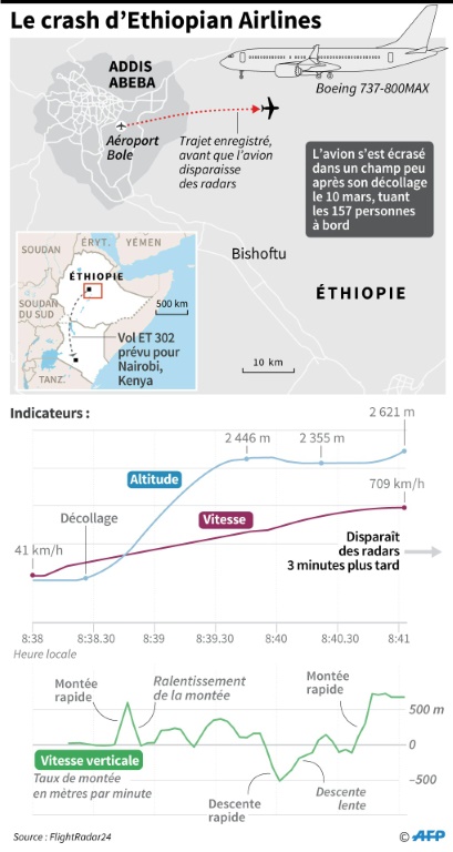 Le vol ET 302, qui avait décollé dimanche à 08H38 (05H38 GMT) d'Addis Abeba, a disparu des radars six minutes plus tard. Selon un témoin, Tegegn Dechasa, l'arrière de "l'avion était déjà en feu lorsqu'il s'est écrasé au sol". Le Boeing, livré courant 2018 à la compagnie et qui avait fait l'objet d'une maintenance le 4 février, a creusé un impressionnant cratère en heurtant le sol, labourant la terre sur des dizaines de mètres de longueur.
