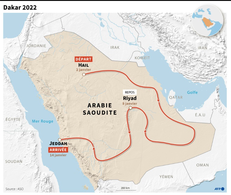 Du départ le 2 janvier à Hail dans le nord jusqu'à l'arrivée le 14 janvier à Jeddah (ouest), le Dakar-2022 proposera un parcours avec plus de sable, notamment dans le quart sud-est du pays, cette immensité de dunes surnommée le "Quart vide".