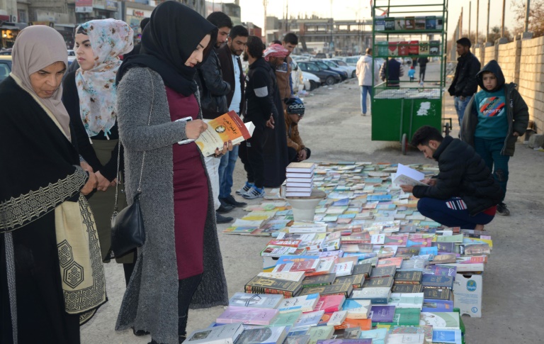 Ali Najam, 23 ans, vient tous les vendredis fureter dans les étals des bouquinistes installés au pied d'un immeuble dont la carcasse de béton a été éventrée par les bombes. Aujourd'hui, il a jeté son dévolu sur une édition en anglais de L'Amour au temps du choléra, du Nobel de littérature colombien Gabriel Garcia Marquez.