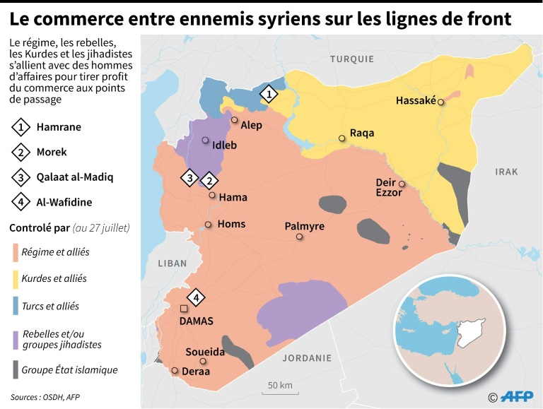 Que ce soit le régime de Bachar al-Assad, les rebelles, les jihadistes ou encore les forces kurdes, ils ont tous établi des liens avec des hommes d'affaires pour tirer profit d'un commerce juteux aux points de passage. Plusieurs sources dans les zones rebelles contactées par l'AFP -commandants militaires,commerçants, militants-, ont confirmé ces "marchés" qui ont permis aux groupes armés et à des hommes d'affaires, dont certains liés au régime de Bachar al-Assad, de s'enrichir dans un pays divisé et ravagé par un conflit dévastateur depuis sept ans.