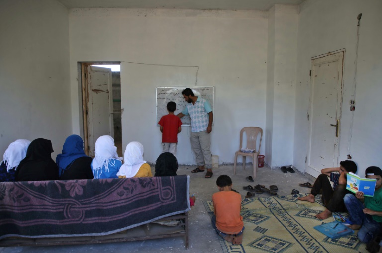 Assis à même le sol, parfois allongés pour mieux écrire sur des feuilles blanches, des enfants écoutent studieusement leur instituteur. Dans les territoires rebelles du nord-ouest de la Syrie, les petits suivent les cours dans une villa abandonnée transformée en école.
