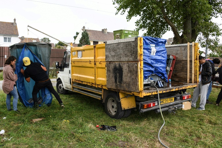 Alors, les associations s'organisent : à l'est de Calais, un camion de l'Auberge des Migrants stationne à côté d'un groupe d'Afghans. Les associatifs déploient une douche confectionnée par leurs soins, avec palette en bois, rideau et pommeau, ainsi qu'un portant de miroirs plébiscités par les migrants, pour un regard, un coup de peigne ou de rasoir. "Les douches sont solaires, alors la météo calaisienne ne nous permet pas d'offrir des douches confortables chaque jour. Ce n'est pas parfait, mais c'est une réponse citoyenne et bénévole", juge Sylvain Marty de l'Auberge des Migrants.