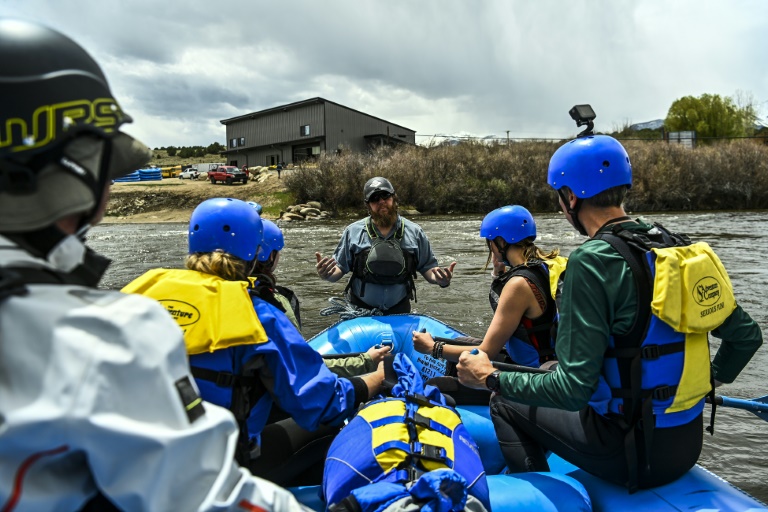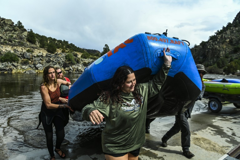 "La rivière a doublé de volume en trois jours", montre Corey Coker sur la rive, au pied des montagnes Rocheuses du Colorado, poussant l'un de ses rafts sur un cours d'eau s'écoulant tranquillement, après des années plus sèches.