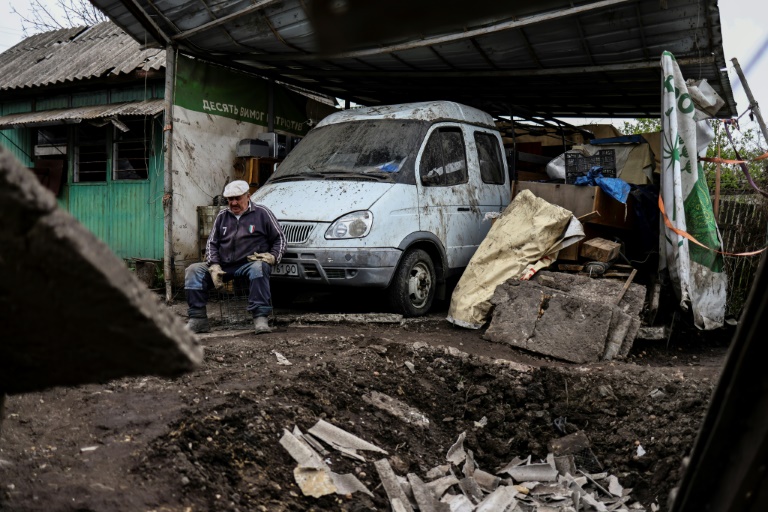Dans le village de Novodruzhesk, un homme est perché sur un poteau électrique et répare un câble sectionné. "Voyez ces deux cratères, je pense que ce câble a été endommagé par un éclat d'obus", explique à l'AFP Victor Pasipko, 68 ans, dont 48 comme mineur, venu aider à la réparation.
