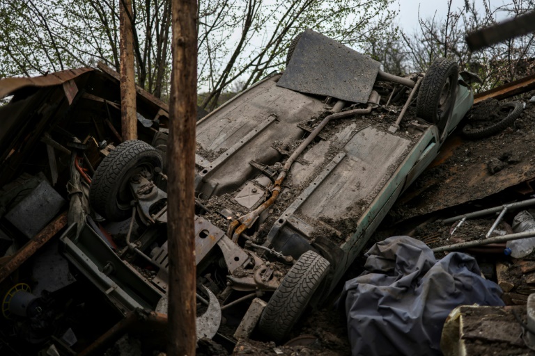 Un cratère, Nadya, 65 ans, et son mari Sergiy, 70 ans, en ont un gros dans leur jardin juste devant leur maison. Le 13 avril, la bombe est tombée là où leur Lada bleue était garée. La voiture git les quatre roues en l'air, sur un monticule de gravats et de restes d'un toit en tôle.