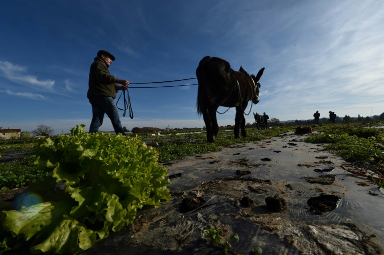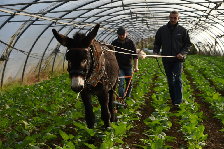 Dans l'écurie, le major de la promo, c'est Diabolo, un "Pyrénées" noir et volontaire. Dès potron-minet, il attaque le sillon gelé par le froid piquant de l'automne, dans un brouillard à couper au couteau. Une demi-douzaine d'agriculteurs convertis au "bio" ou fraîchement installés avec peu de moyens, sont venus d'Ile-de-France, Occitanie ou Nouvelle-Aquitaine pour apprendre aussi l'art de biner l'épinard, butter la salade, ou griffer la blette sur 5.000 m2 de "tunnels" (serres).