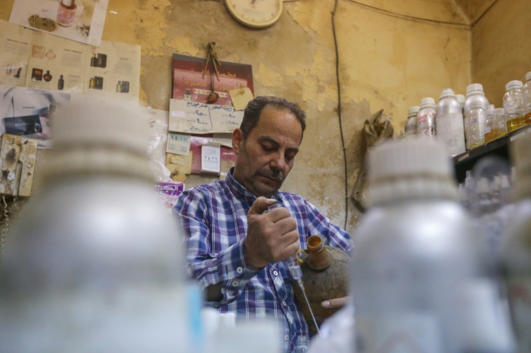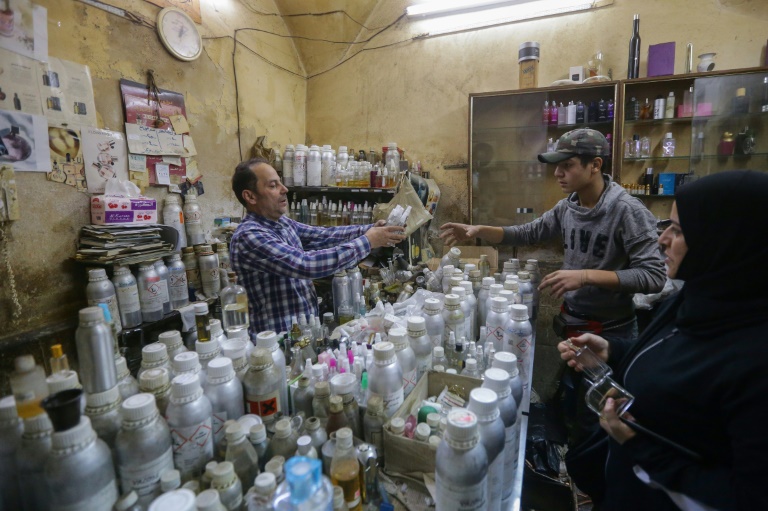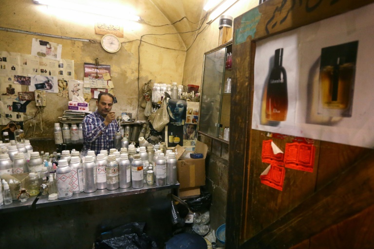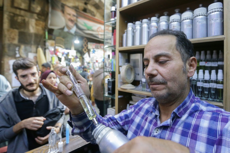 Dans une échoppe du vieux Damas, Mohammad al-Masri mélange des essences dans des dizaines de fioles, recréant pour sa clientèle appauvrie par la guerre et la crise économique les parfums de luxe désormais hors de prix.