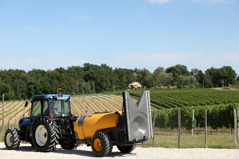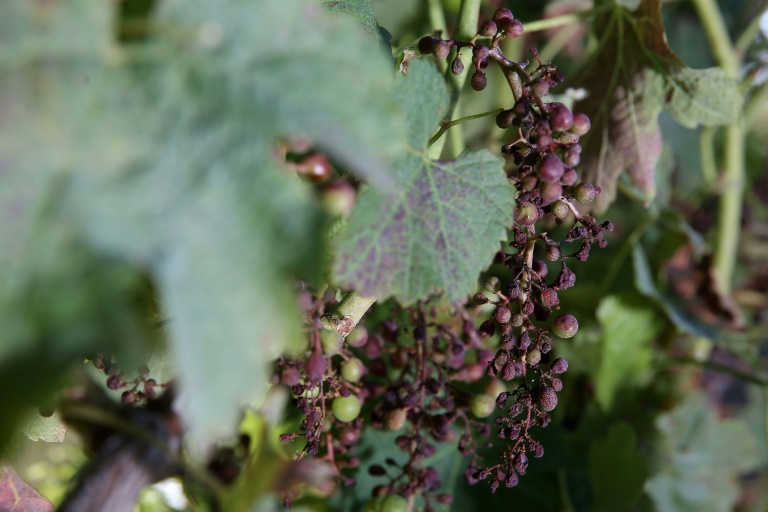 Julien Luro sait que la "lutte est sans appel". Sur les coteaux de l'Entre-Deux-Mers, des petites baies de merlot d'un vert éclatant virent inexorablement au brun-rouge, signe de la présence du mildiou, dont la virulence cet été menace le vignoble bordelais, en plein marasme.