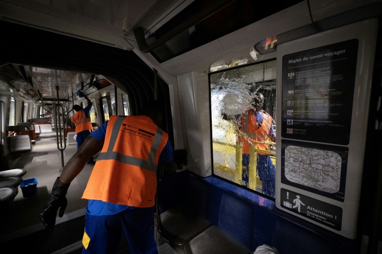 Un matin ordinaire au centre de maintenance RATP de la ligne 14 à Saint-Ouen, près de Paris: sept agents récurent un métro du plafond au sol - et non l'inverse -, trois semaines avant l'effervescence des JO qui seront un défi majeur pour la propreté dans les transports franciliens.