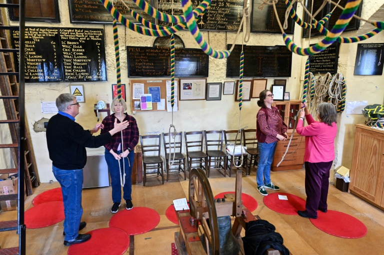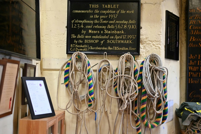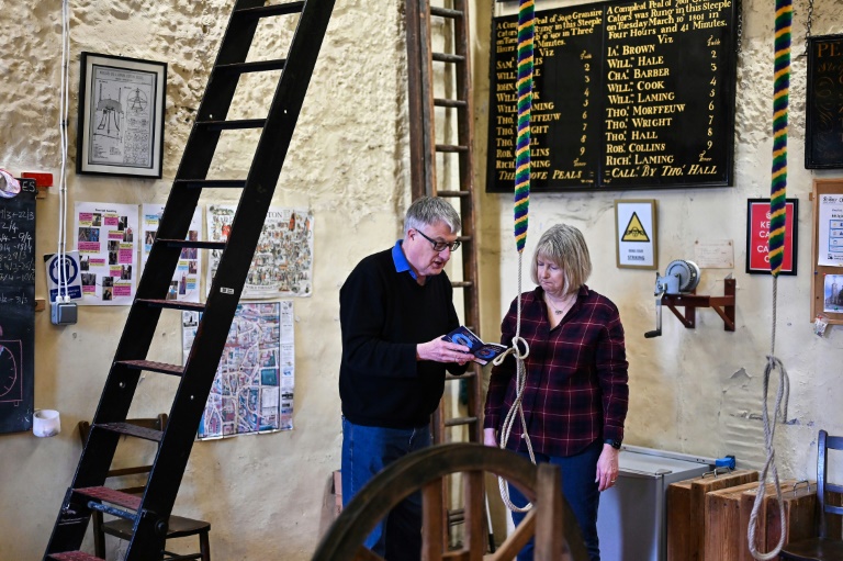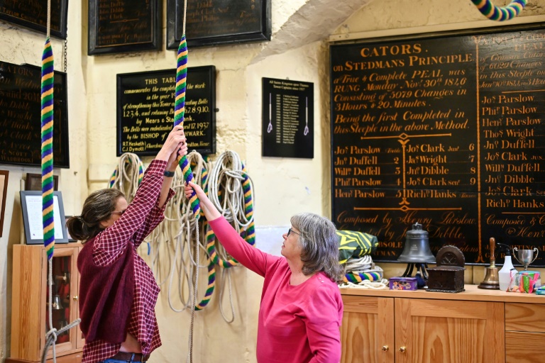 Au sommet de l'escalier raide et étroit de l'Eglise de Tous-les-Saints de Kingston Upon Thames, près de Londres, des sonneurs de cloches expérimentés mettent à l'épreuve deux nouvelles recrues.