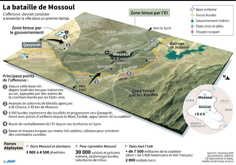 Selon des sources militaires, l'est de Mossoul devrait être significativement plus facile à reprendre que sa moitié ouest, considérée comme le vrai repère des jihadistes dans cette ville où ils ont déclaré en juin 2014 leur "califat" sur les portions de territoires conquis en Irak et en Syrie.