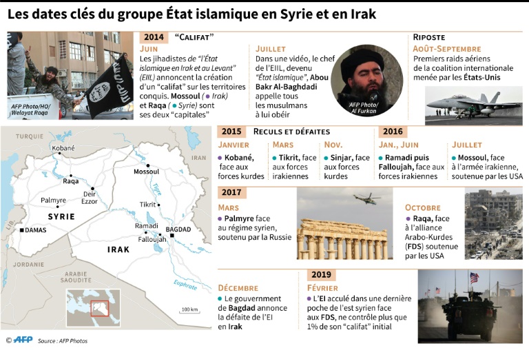 L'organisation ultra-radicale avait conquis en 2014 de vastes pans de territoires et des grandes villes en Syrie et en Irak, sur une superficie comparable à un pays comme la Grande-Bretagne. Mais, du "califat" autoproclamé, il ne reste aujourd'hui que quelques centaines de jihadistes pris au piège dans un ultime réduit, dans la province de Deir Ezzor.