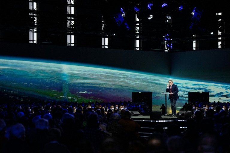"C'est la planète bleue!", s'est écrié en pointant du doigt le tribun alors que se déployaient sur les quatre murs de 50 mètres de largeur un visuel projetant les 3.000 militants de l'assistance dans l'espace.