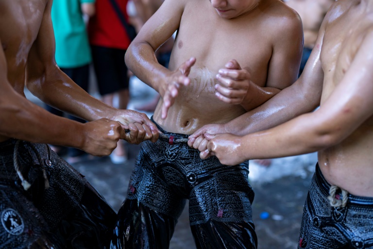 L'épreuve commence avec le passage du pantalon des pehlivans, 10 kilos de peau de buffle, surpiqué et clouté, déjà huilé, noué par une corde mais dépourvu de braguette: il faut s'y glisser nu, au prix de contorsions épuisantes sous le soleil déjà brûlant.