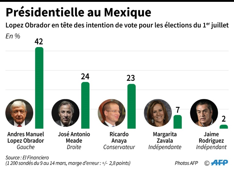 Selon de récents sondages, il recueillerait plus de 40% des intentions de vote, devançant Ricardo Anaya et José Antonio Meade, le candidat du Parti révolutionnaire institutionnel (PRI), le parti au pouvoir. MM. Anaya et Meade sont crédités tous deux d'entre 20 et 30% des intentions de vote.