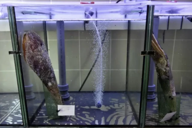 Là-bas, calées au fond d'un bassin par paires, elles sont soumises par le chercheur à un choc de température qui va favoriser une libération de gamètes.