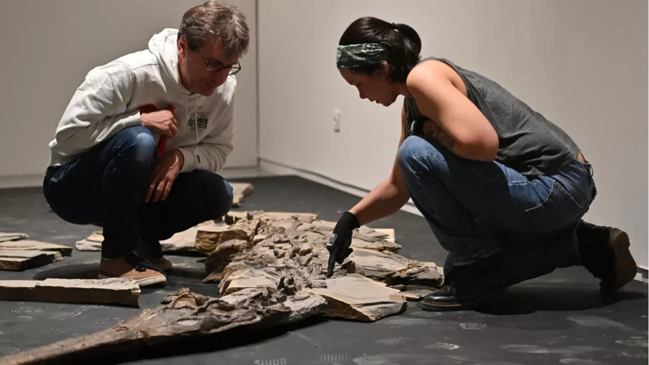La fossile était "recouvert d’une grosse couche de sédiments", explique Camille Auclair, restauratrice et paléontologue pour la société Kraniata. "On a retiré des petits morceaux petit à petit et à la fin, par sablage, avec des grains de différentes densités, on est venus retirer la fine pellicule de sédiments qui restait, pour vraiment rendre le fossile parfaitement lisible et faire ressortir tous les petits détails".