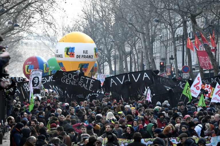 Les manifestants marchaient derrière leur désormais traditionnelle banderole de tête affichant "Retraite à points: tous perdants, retraite à 60 ans: tous gagnants". "Retraités à points, retraités à poil", proclamait une pancarte. Devenue traditionnelle aussi, la chorégraphie de féministes vêtues de bleus de travail sur l'air de la chanson "A cause des garçons", détournée en "à cause de Macron".