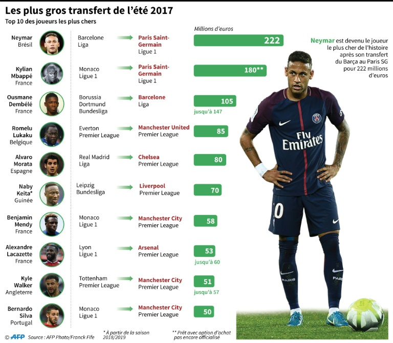L'enveloppe pour Neymar (acheté au Barça 222 M EUR) et Kylian Mbappé (qui doit rejoindre le club en provenance de Monaco pour un prêt avec option d'achat de 180 M EUR) est colossale. Au moins Dani Alves est arrivé libre de la Juventus.